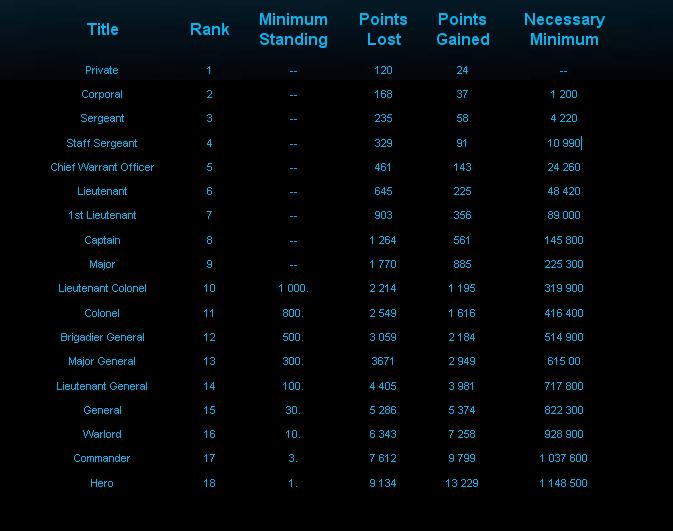ни минимум а максимум может быть например 300 маёоров генералов!) по поводу получение очков и понимаю так за убийство вар лорда ты получаешь 7258 очков) ну по последнему вообще всё легко.как лвл ап.набиваешь очков и батц ты уже на ранг выше) ______________________