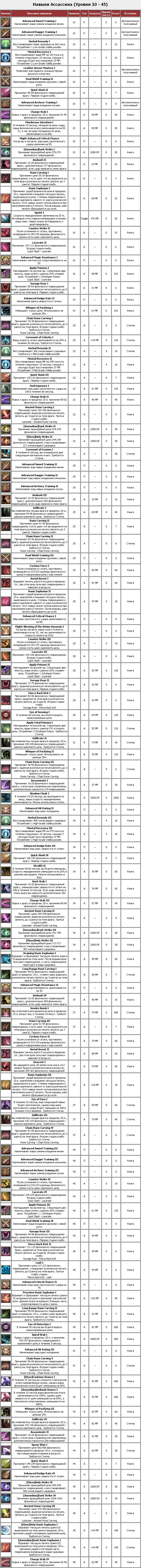 Нюанс следующий. Точное время действия, время каста и т.п. Лично я считаю, что пока что это не нужно тем, кому эти скиллы нужны только для того, чтобы определиться с классом. Поясню почему. Дело в том, что игра только-только вышла у самих корейцев, в европе еще не вышла. Скиллы будут меняться чуть ли не каждые два дня, потому что, как всегда будут сменяться убер-классы (например, докачались игроки до 25 лвла и поняли, что рулит, скажем, сорк из-за нереально мощного каста, появляющегося на этом лвле. Увеличили время каста этого спелла, еще что-то доработали, вроде как довели до ума, добились баланса. Потом игроки докачались до след. апа. История повторяется с другим классом. И т.д.). То есть, проблема не в том, что нам лень после каждого фикса вносить изменения в список скиллов, а в том, что игрок, прочитавший, что у сорка на 25 лвле эдакий уберский каст, начнет качать сорка, чтобы овнить, а потом, когда скилл порежут, поймет, что сорк-то уже вовсе не убер, а как неуберский чар он ему вовсе не нужен. Так что я считаю, что с классом надо определяться по простейшему и наиболее обобщенному списку скиллов, а-ля "может носить не только лайт, но оказывается и робу, здорово", "у ассасина качаются не только даггеры, но еще мечи и луки". И при этом новому игроку совсем не обязательно морочить себе голову цифрами, типа "даггер мастери лвл3 дает на 27 больше п атаки, чем даггер мастери лвл2". Такие вещи проще и лучше проверять опытным путем.
